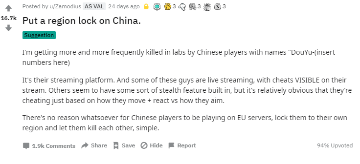 Recently, a group of Chinese cheaters caused a big sensation in Escape from Tarkov, about tens of thousands of players in major game forums called to “Region lock China”.